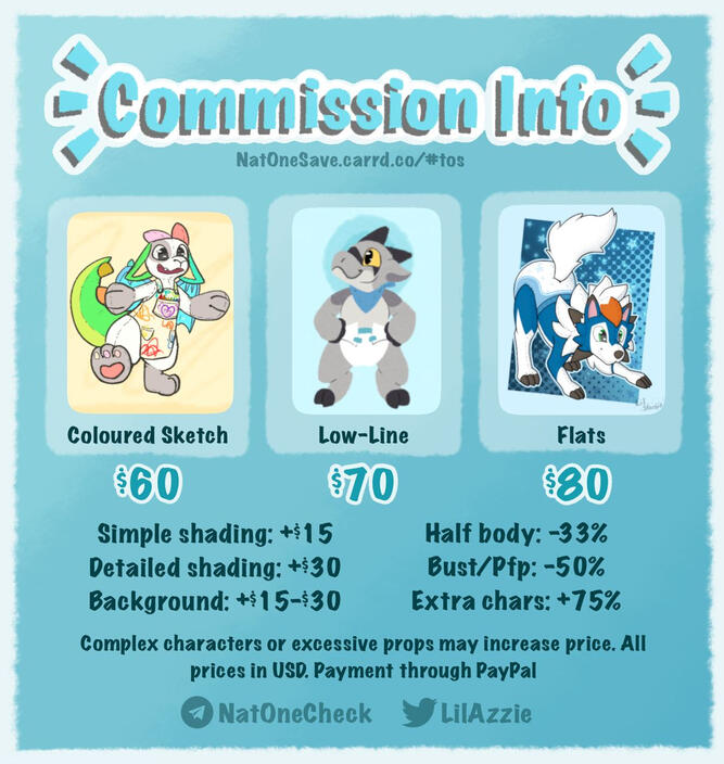 I am currently dealing with a persistent health issue that makes me unable to take on comms. The below prices and styles may change by the time I am able to open again. Thank you for your understanding.